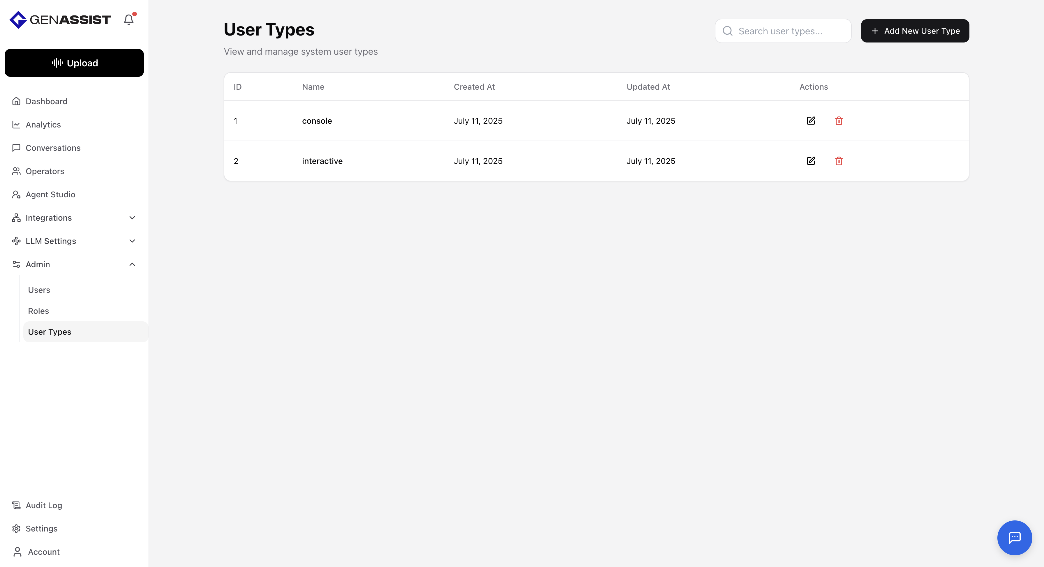 To manage user types, navigate to Admin → User Types from the main navigation menu. This will display a list of all existing user types.