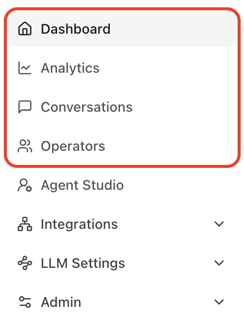 In addition to the Dashboard, analytics are also accessible in dedicated tabs in the left-side navigation panel: Analytics, Conversations, and Operators. These tabs allow users to explore specific areas of data in more detail and perform management tasks where applicable.