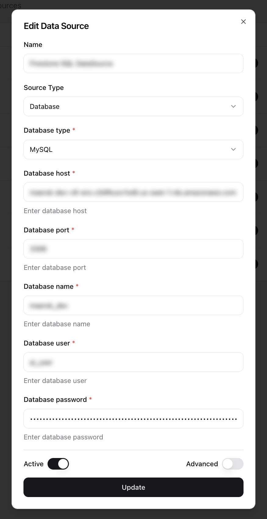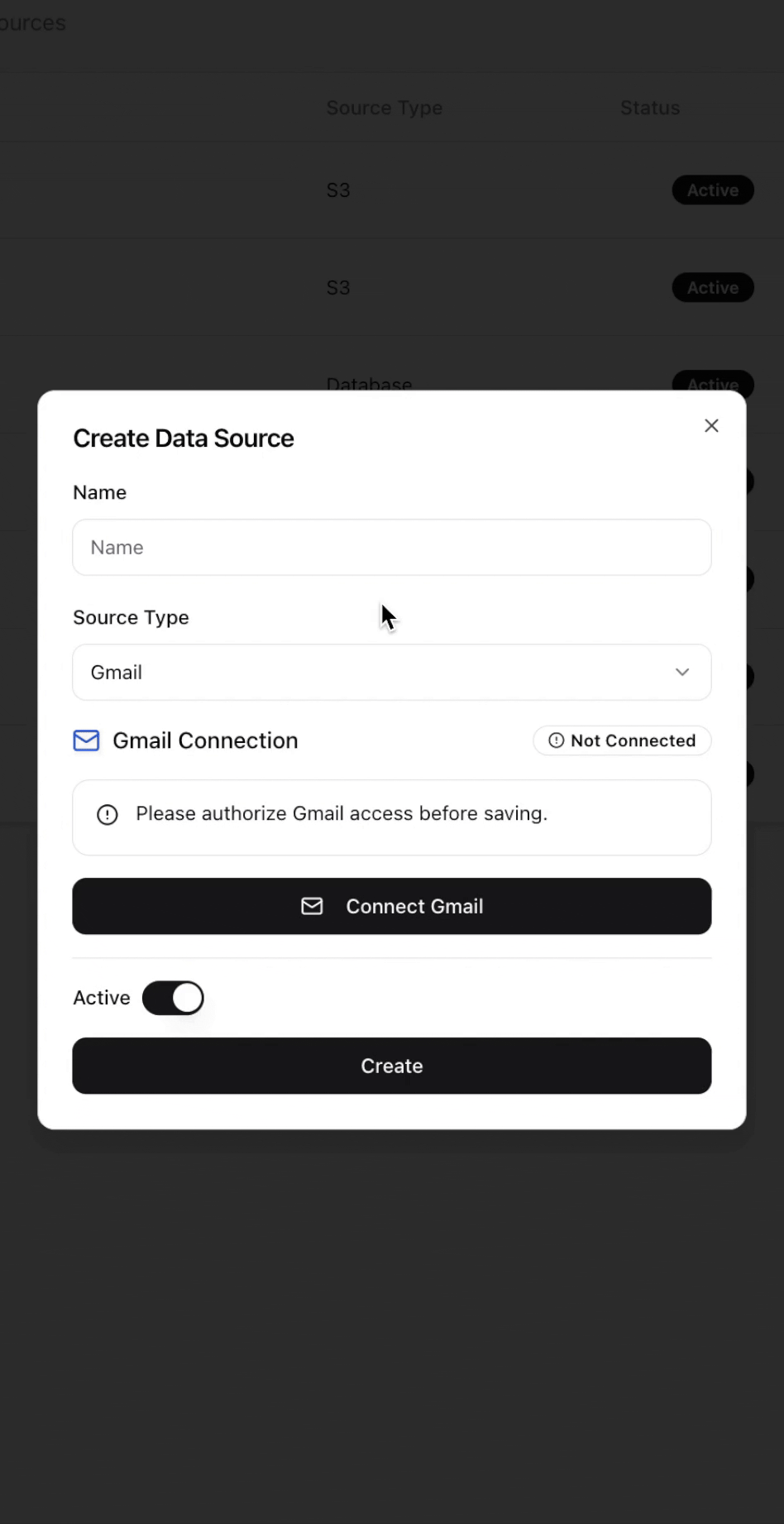 - Toggle the Active switch to enable the data source immediately after creation.
