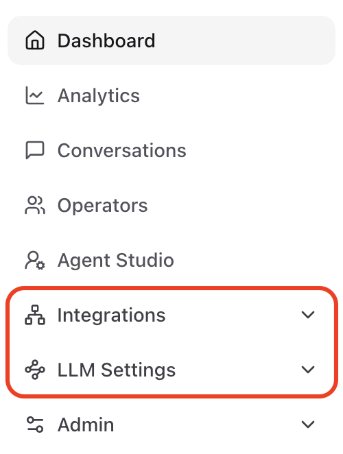 The main navigation menu organizes these into two categories: Integrations and LLM Settings.