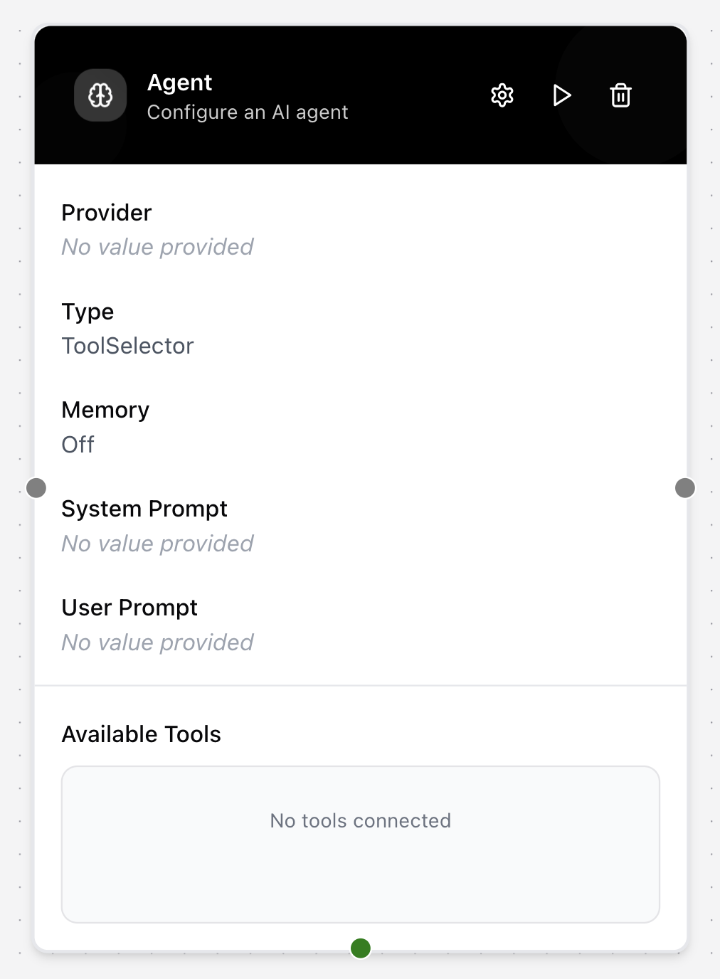The Agent node acts as an advanced LLM that can use a set of predefined “tools” to perform actions. This allows it to complete more complex tasks by interacting with other nodes.