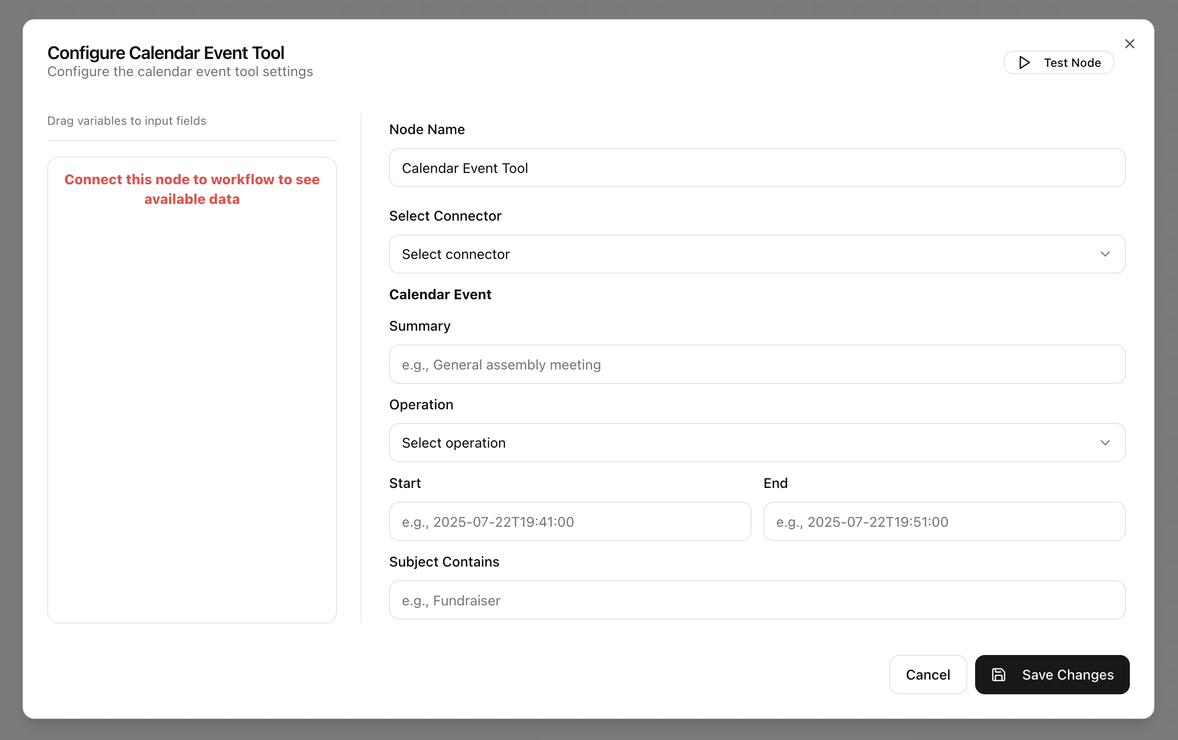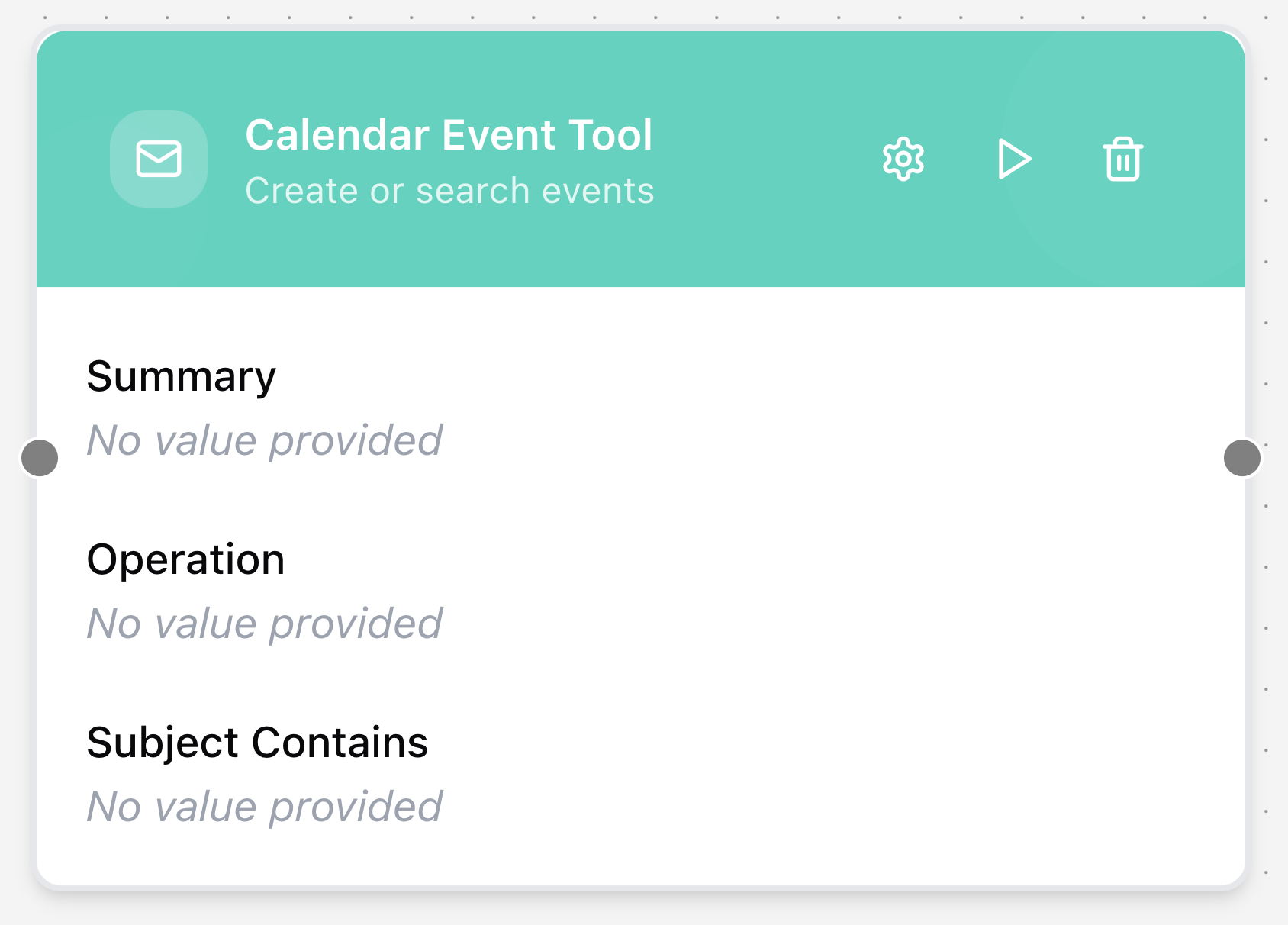 The Calendar Event Tool node interacts with connected calendar services to create, search, and manage events. Use it to schedule meetings or query existing events via Gmail or Office365 connectors.