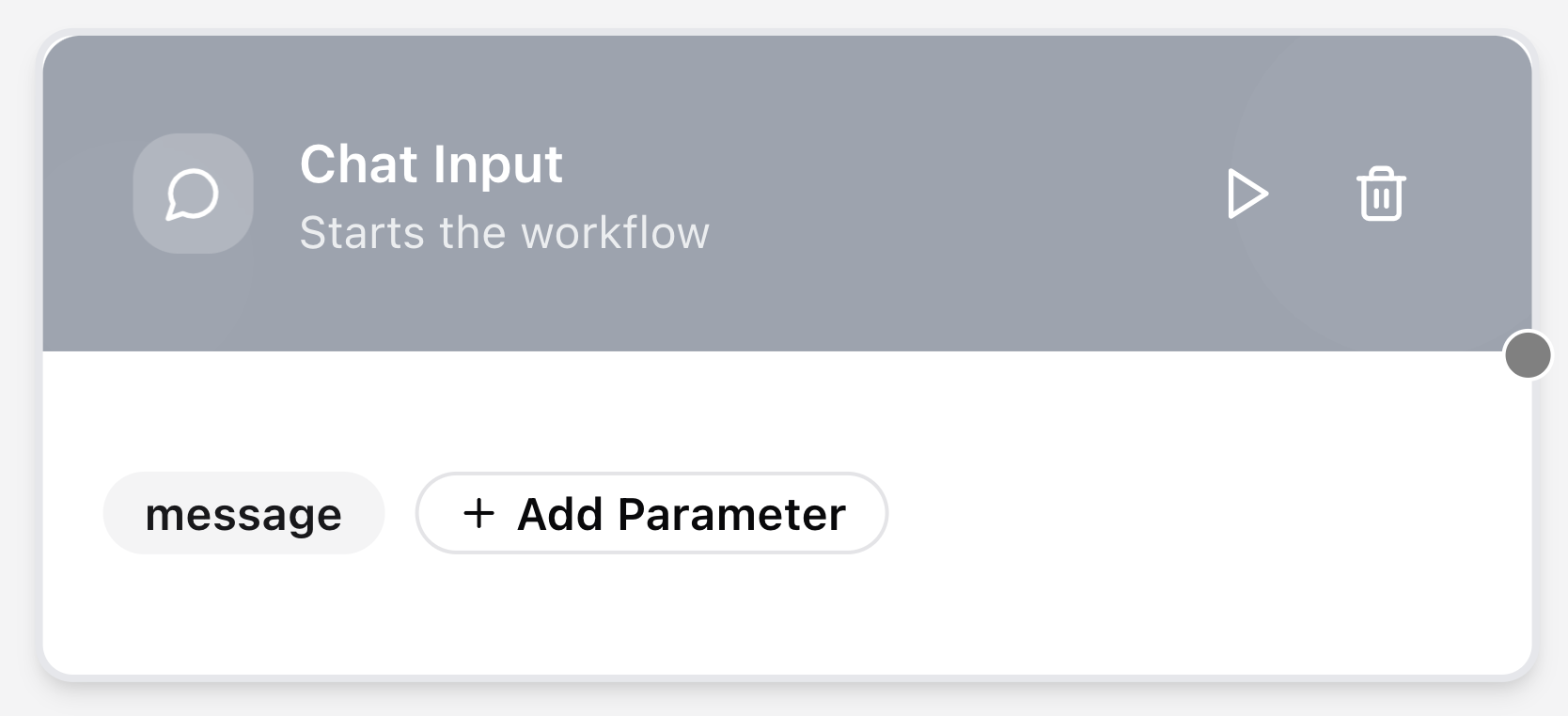 The Chat Input node serves as the entry point for a workflow, defining the initial data the workflow expects to receive from a user. It is always the first node and cannot have any nodes preceding it.