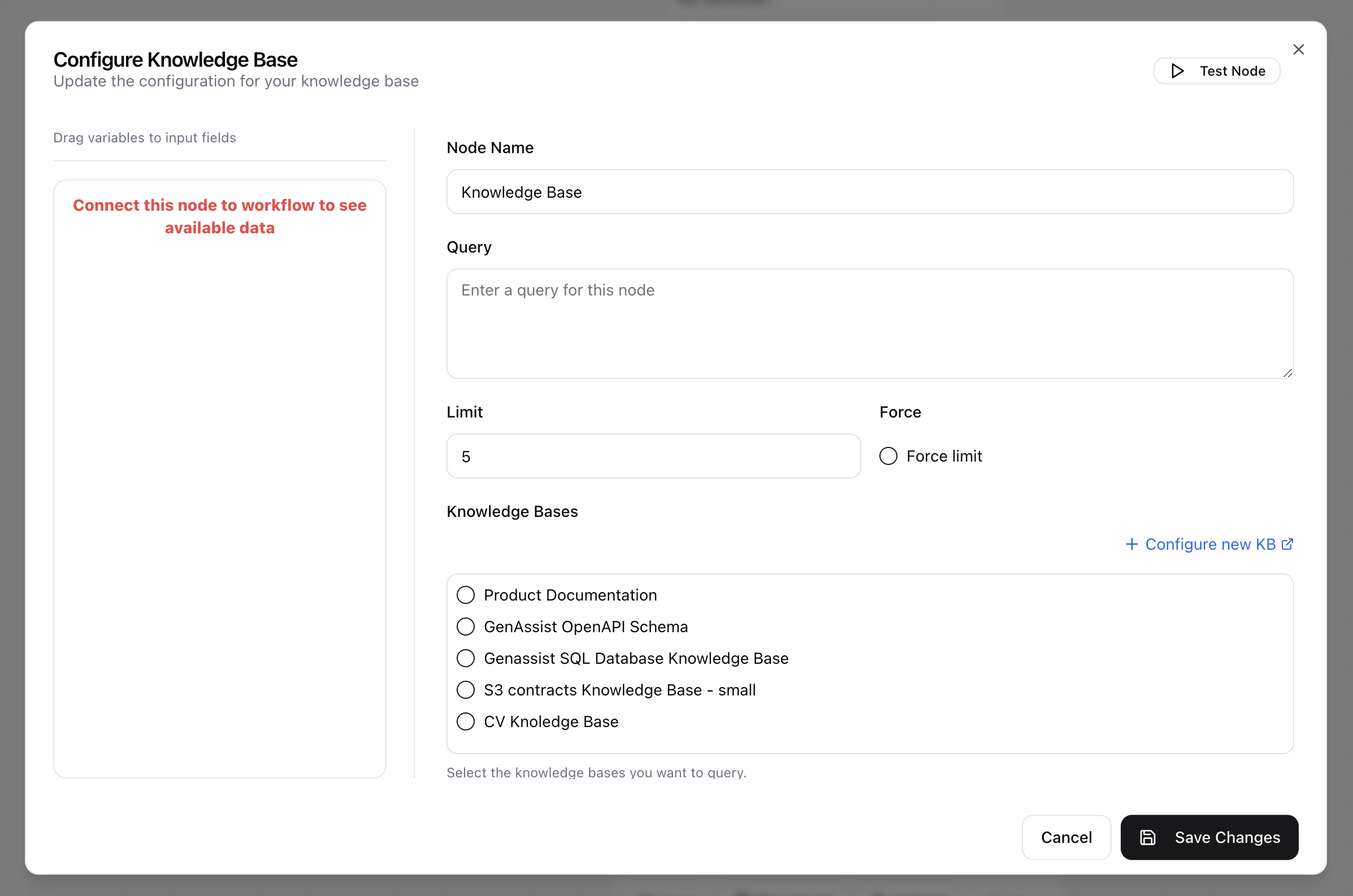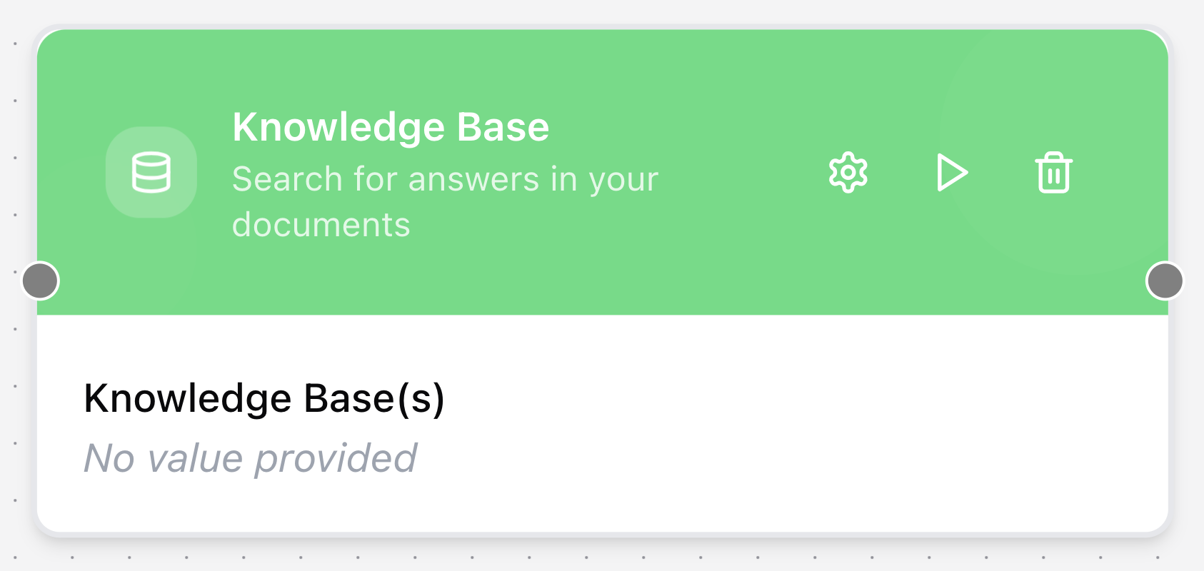 The Knowledge Base node retrieves information from multiple knowledge bases. It uses Retrieval-Augmented Generation (RAG) to search a preconfigured collection of data and return relevant context, often for use by an Agent node.
