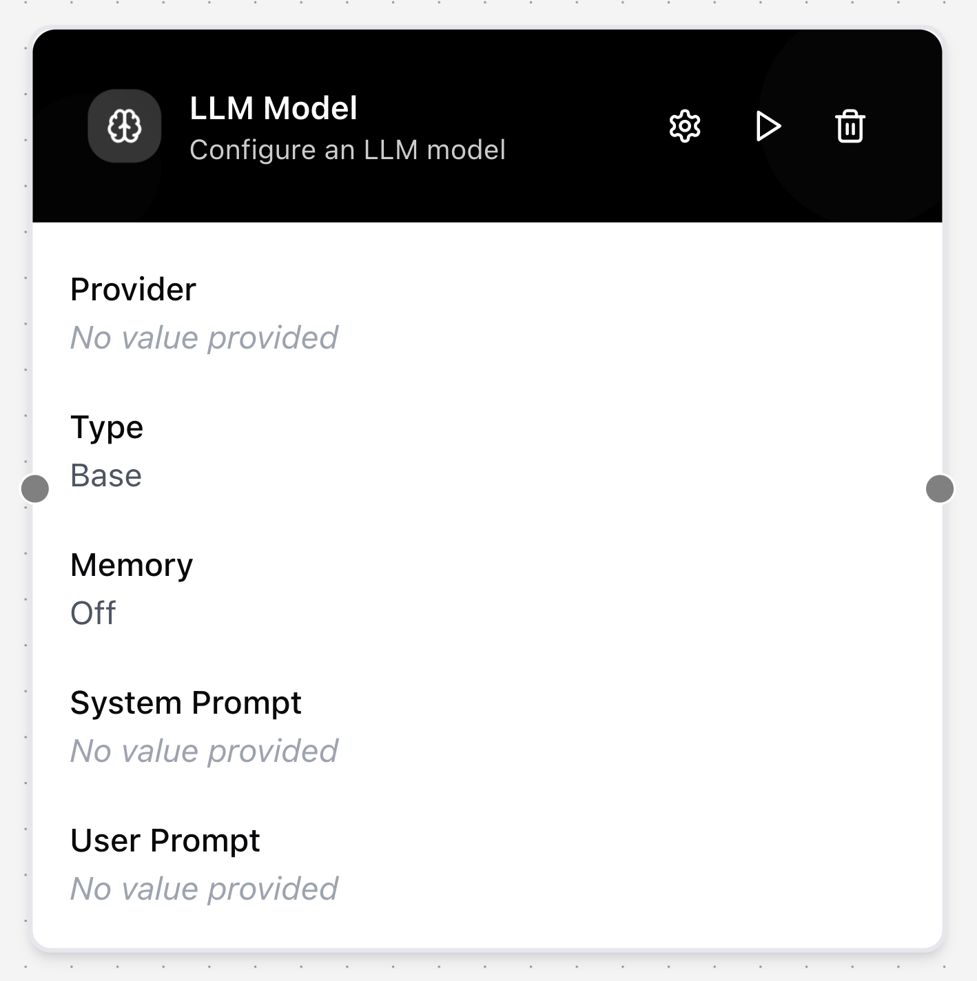 The LLM Model node is a core component for interacting with a Large Language Model (LLM). It sends a prompt to a selected provider and returns the generated response, enabling tasks like answering questions, summarizing text, or engaging in conversation.