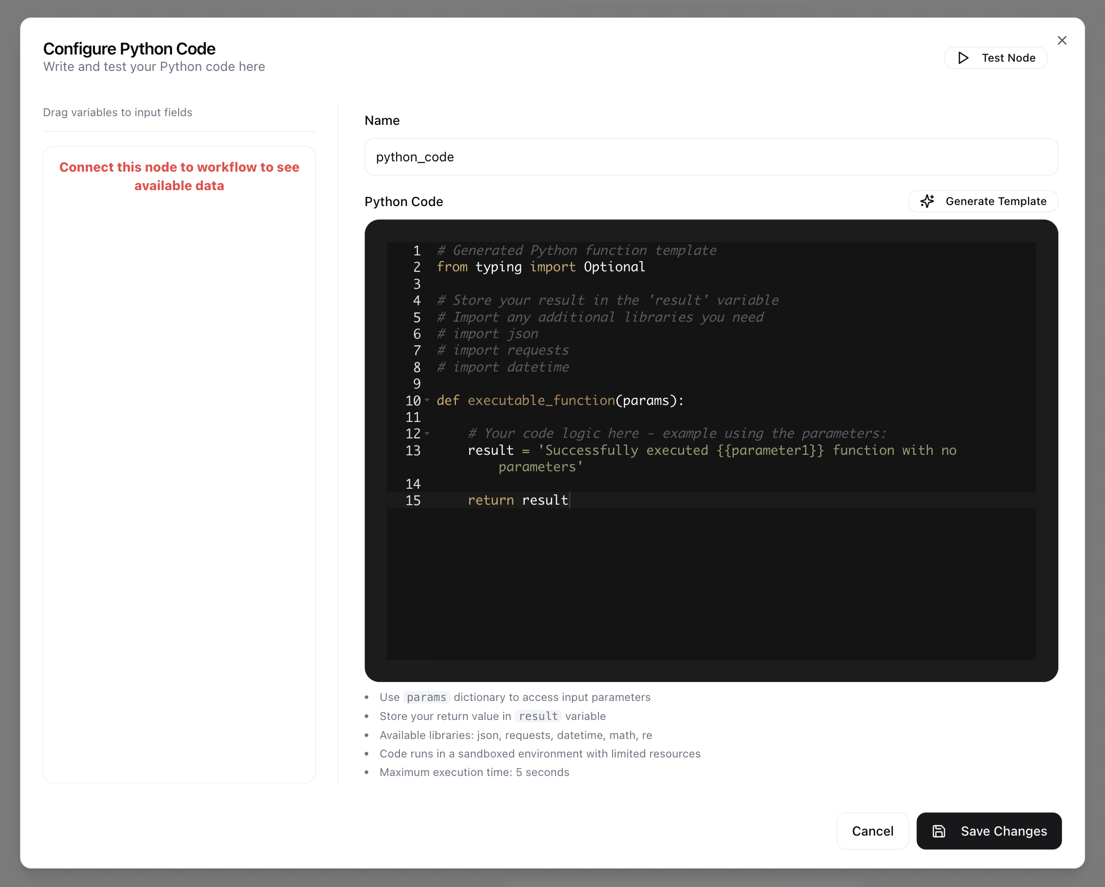 resultvariable. This becomes the node’s output for subsequent workflow steps. - The following standard libraries are available:
