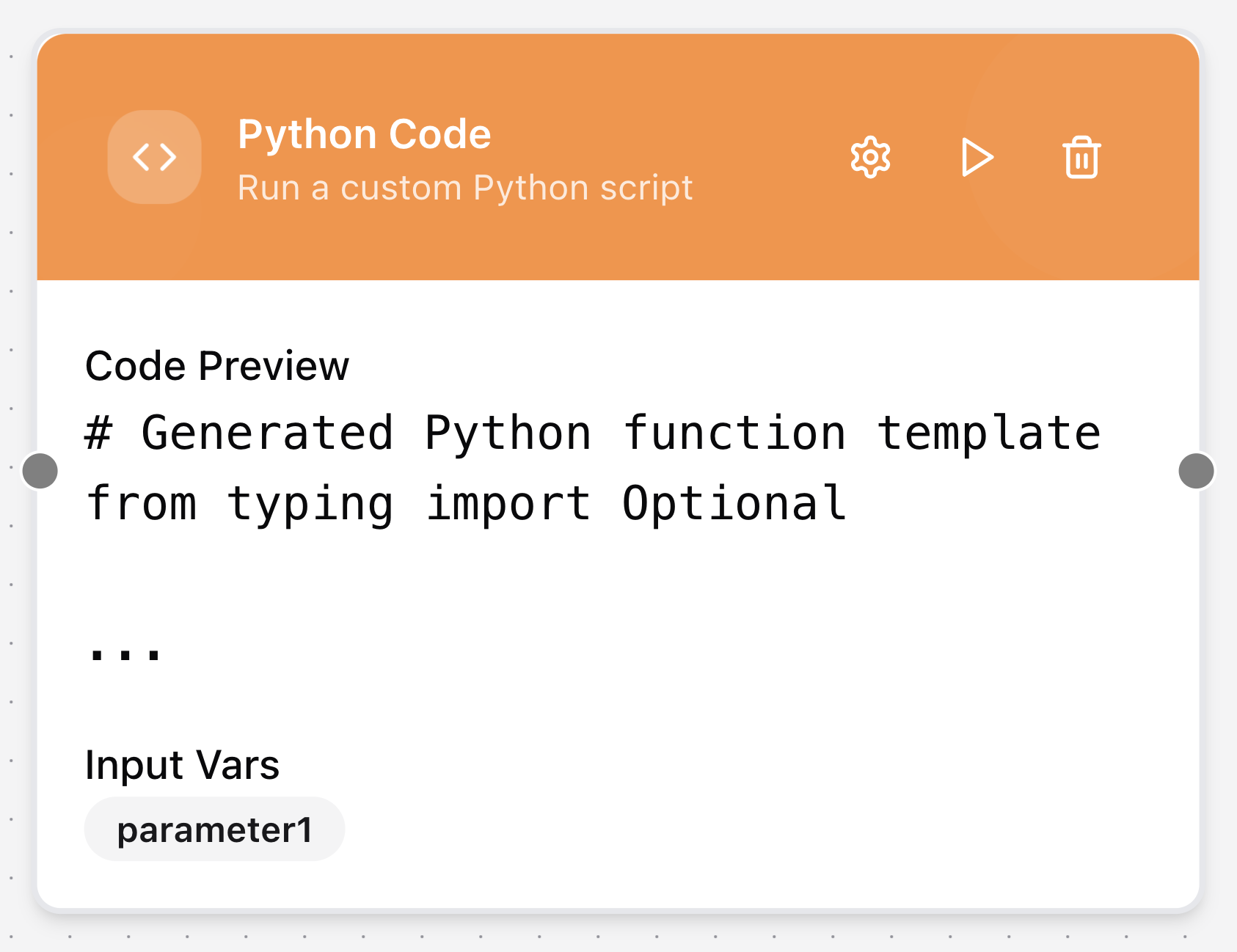 The Python Code node executes custom Python scripts. It enables workflow developers to implement advanced logic, computations, and data transformations that require full scripting capabilities. Execution takes place in a sandboxed environment with limited resources and must follow these rules: