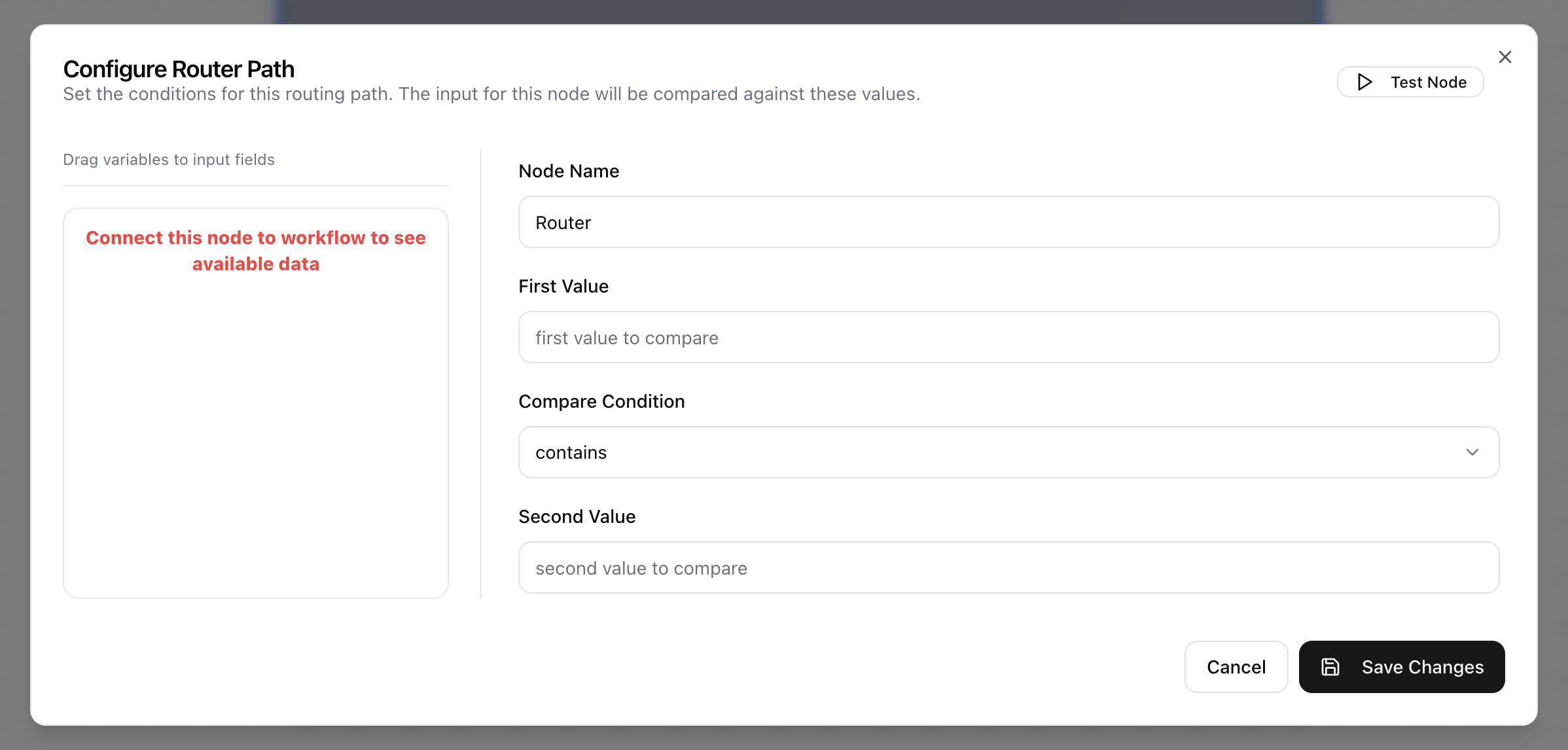 The Router node introduces branching logic into a workflow. It evaluates conditions and directs execution down different paths depending on whether the criteria are met.
