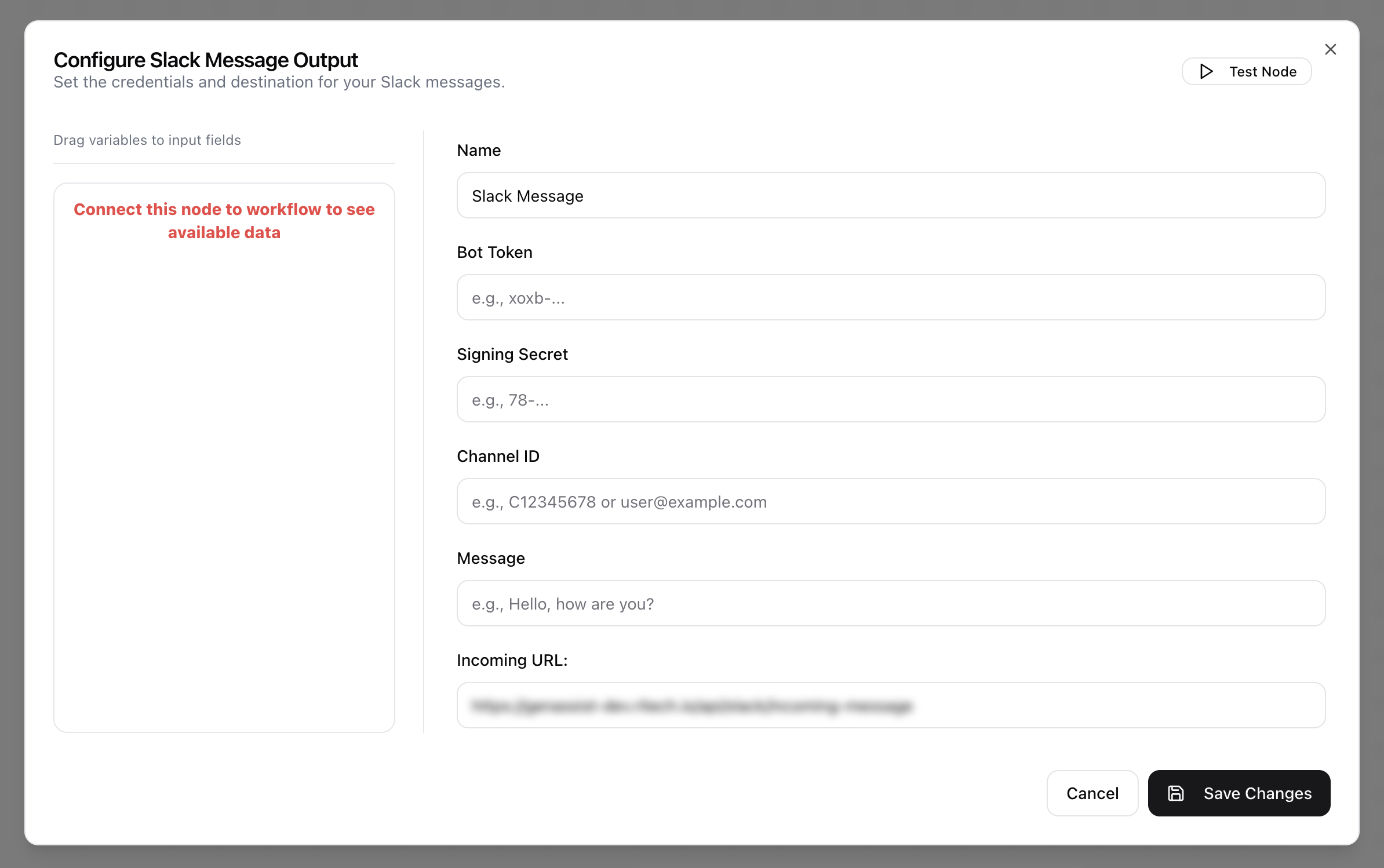 - The Configure Slack Message Output dialog will open.
