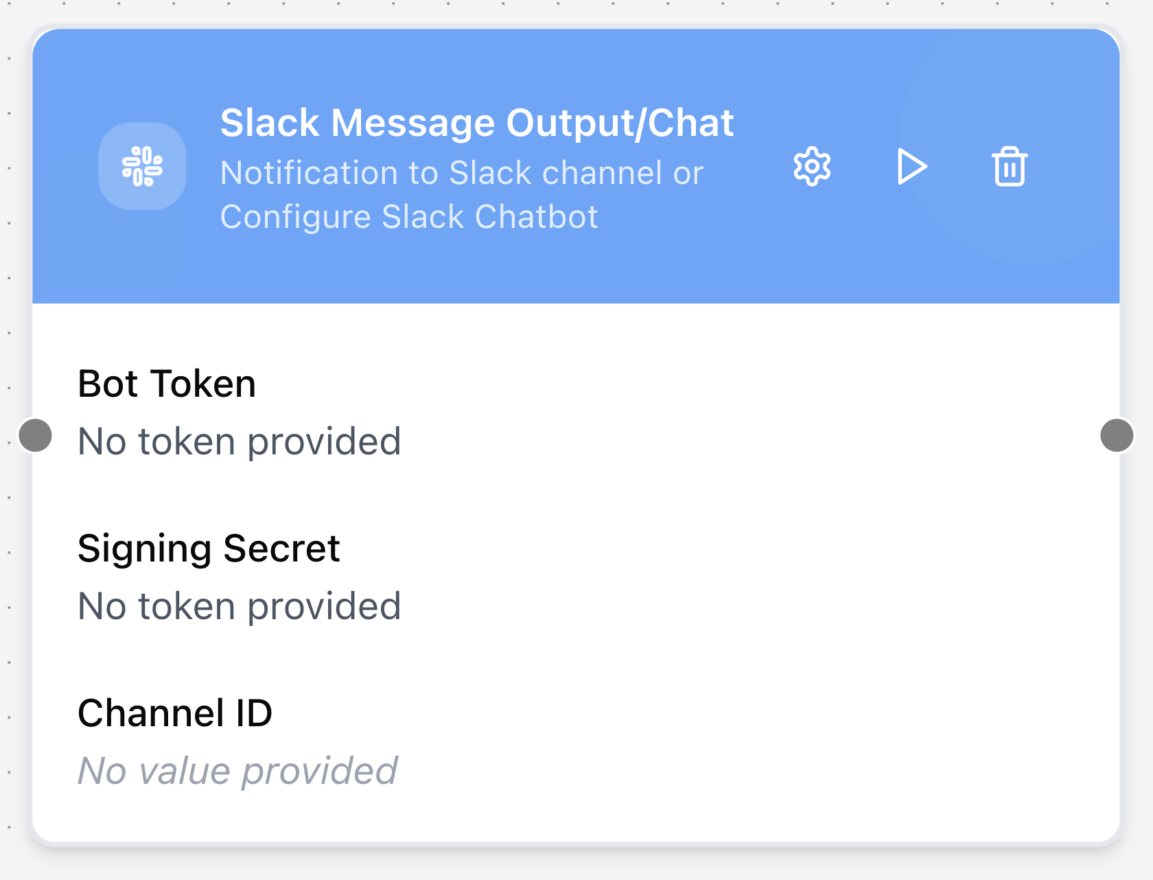 The Slack Message node integrates directly with Slack. It can either send messages to a Slack user or channel, or receive incoming chat messages. This enables workflows to interact seamlessly within a Slack workspace.