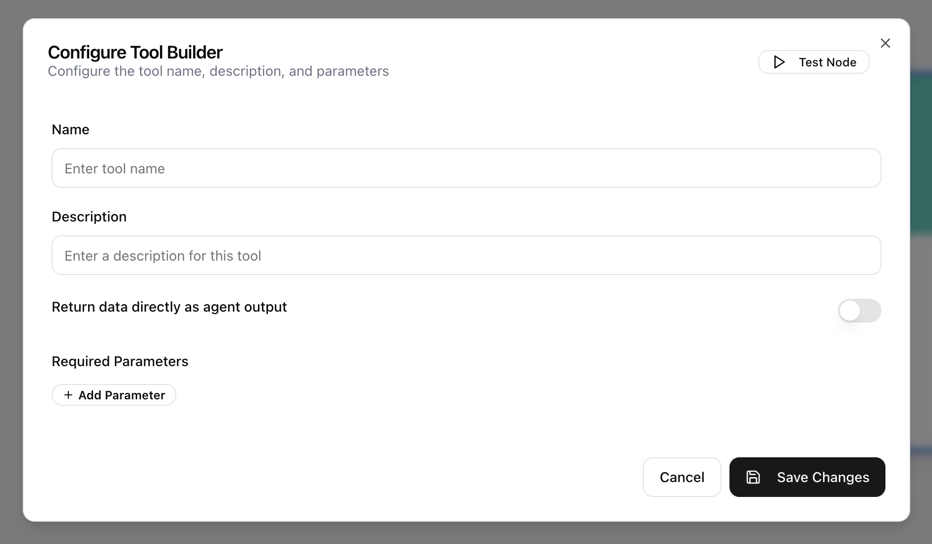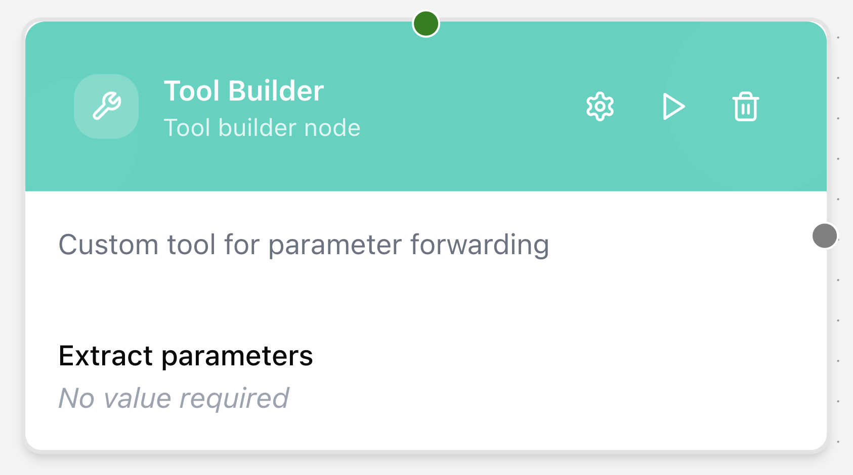 The Tool Builder node acts as a bridge between a tool node (e.g., a Knowledge Base node) and an Agent node. It wraps the functionality of the tool node, giving it a clear name, description, and set of parameters that the agent can understand and decide when to use.