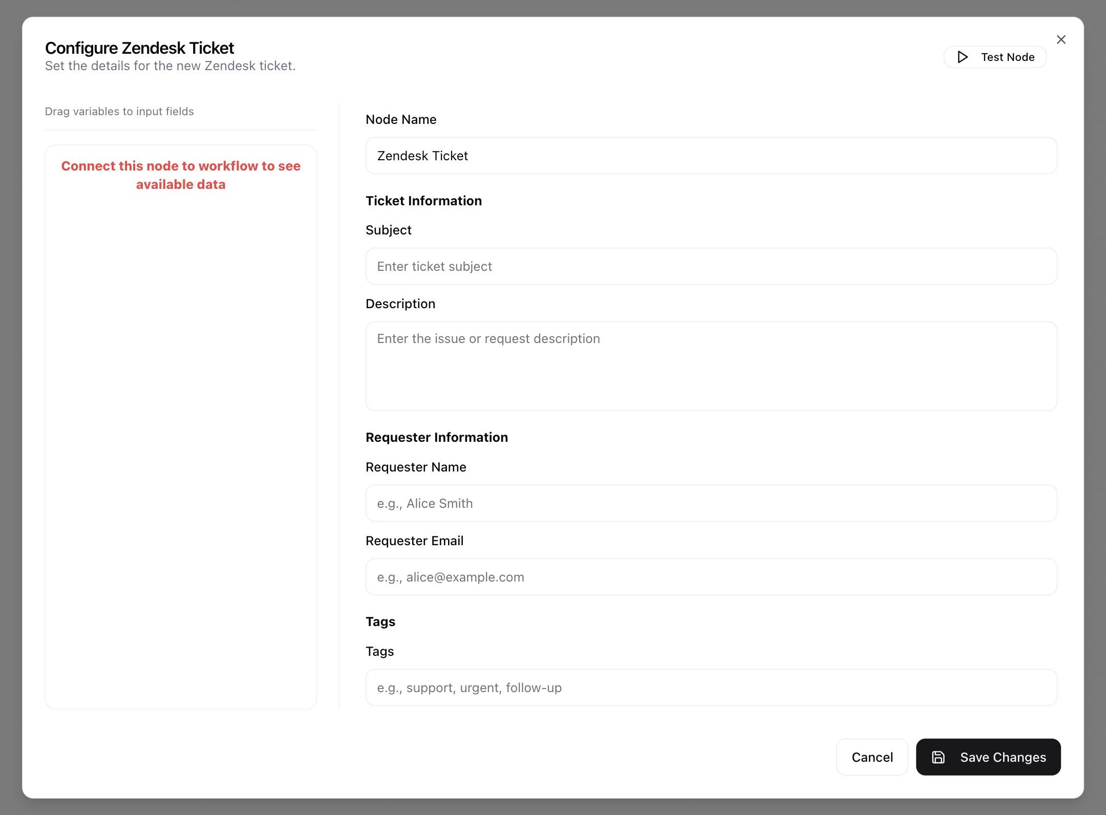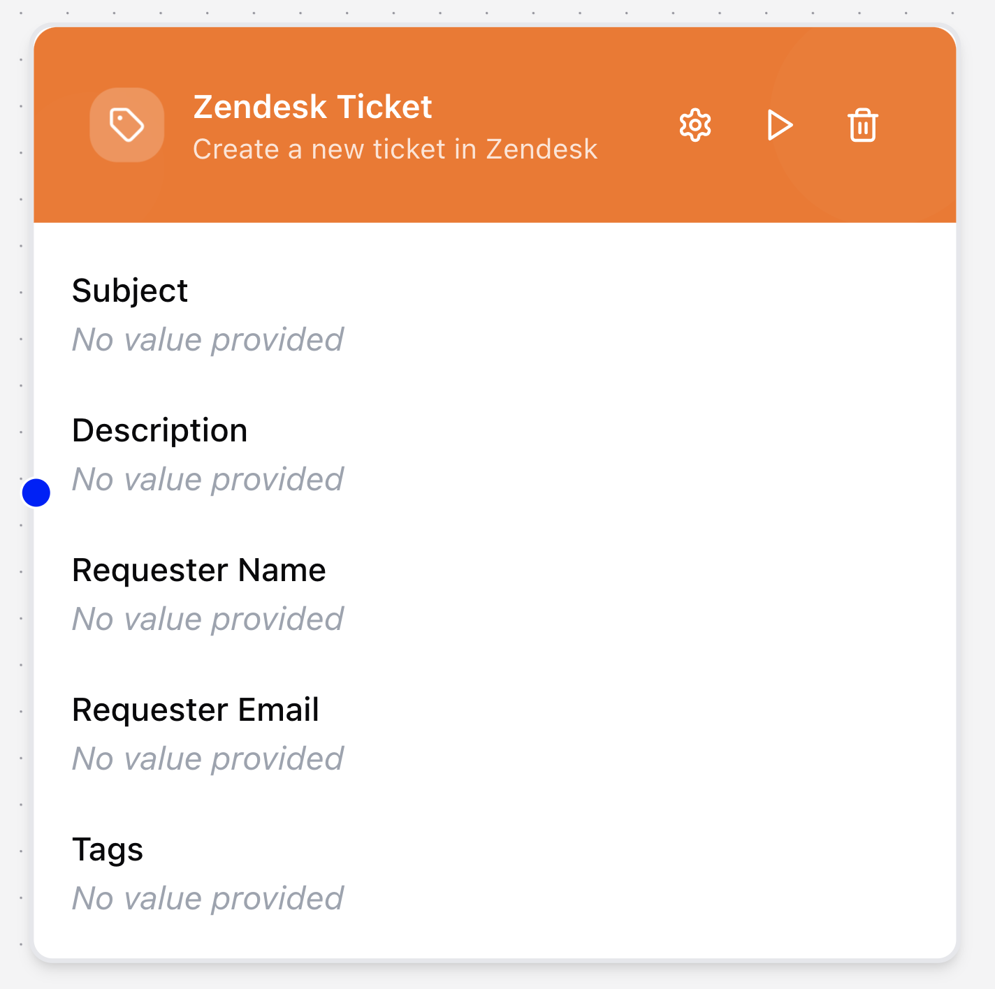 The Zendesk Ticket node creates new tickets in Zendesk through the API. It enables workflows to automatically escalate customer issues, log requests, or generate follow-up tasks directly in your Zendesk support system.